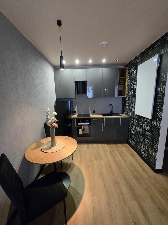 Mimo kompaktowego metrażu, dzięki pomysłowej aranżacji udało się wyraźnie wydzielić strefę dzienną i kameralną sypialnię, zapewniając komfort i prywatność.